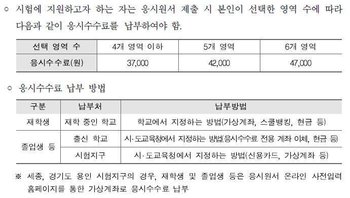 - 응시수수료: 선택 영역 수에 따라 37,000원부터 47,000원까지