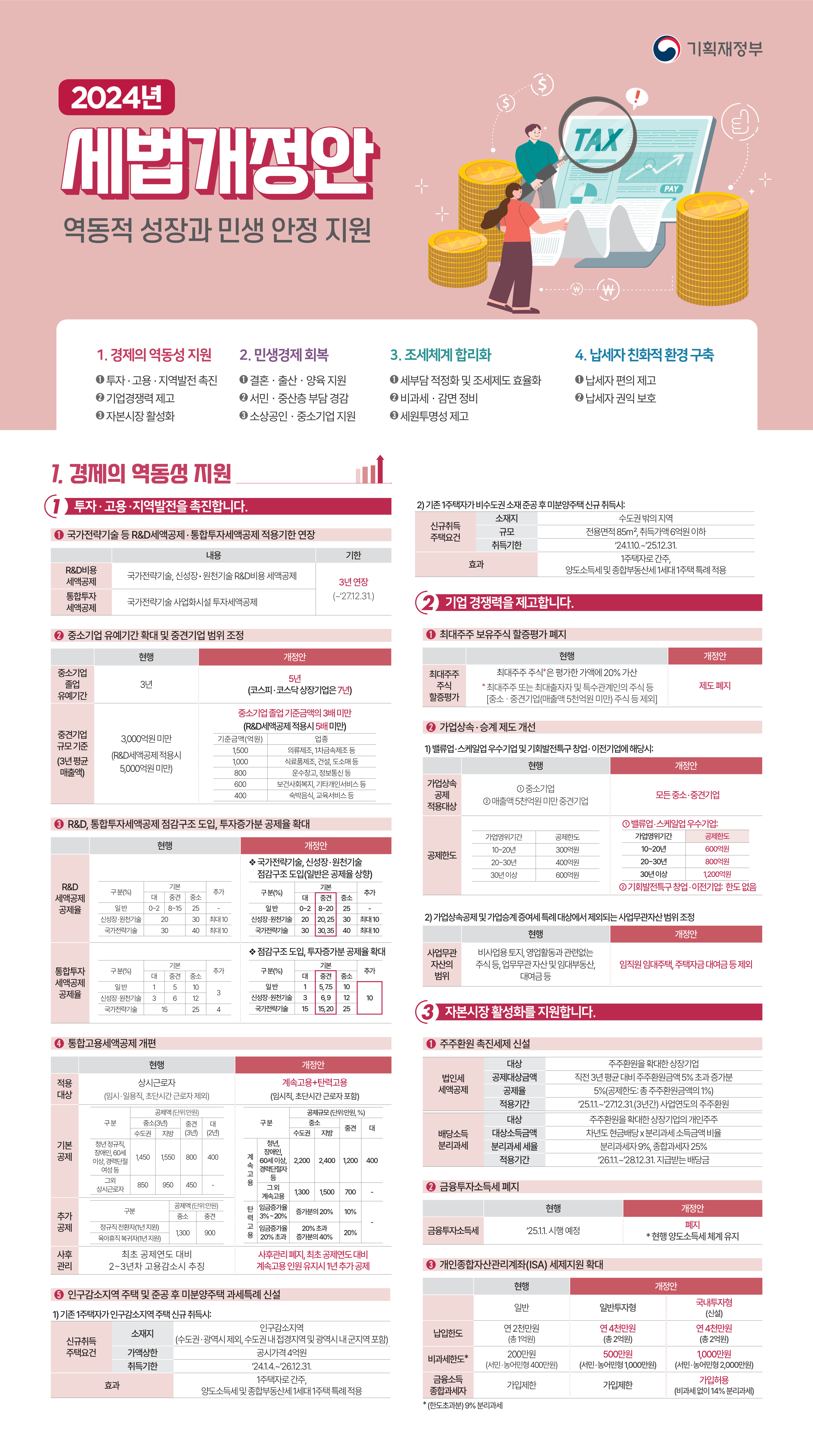 정부의 '2024년 세법개정안'은 상속세 인하, 금융투자소득세 폐지, 가업상속공제 확대 등 다양한 조치로 경제의 역동성을 지원하고 민생경제를 회복시키기 위한 중요한 발걸음입니다.