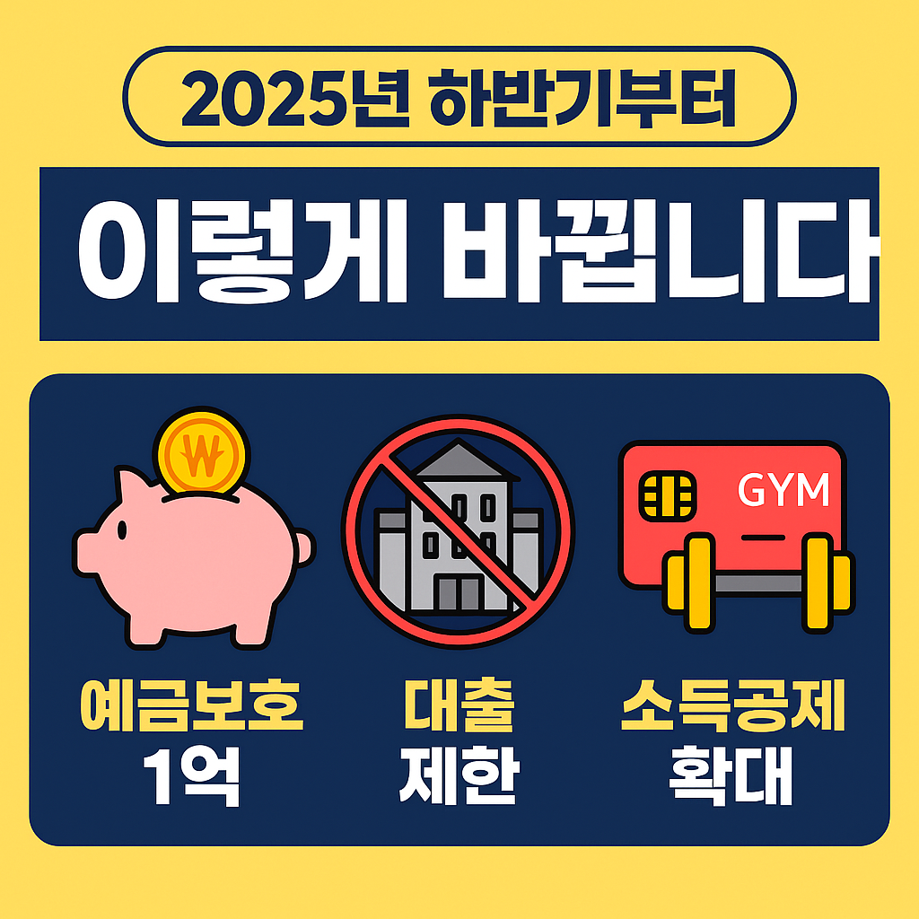 2025년 하반기부터 국민 실생활에 영향을 미치는 대출 규제, 예금 보호 한도 확대, 소득공제 혜택, 장학금 확대 등 주요 정책들이 대거 시행됩니다. 특히 수도권 주택담보대출(주담대) 규제는 실수요자와 투자자 모두가 주의 깊게 봐야 할 핵심 내용입니다. 또한 예금자 보호 한도 1억 원 확대, 헬스장·수영장 소득공제, 육아휴직 지원 확대 등 실질적인 혜택도 포함돼 있어 꼭 확인해야 합니다.