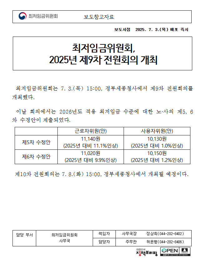 2025년 7월 3일, 정부세종청사에서 열린 최저임금위원회 제9차 전원회의에서 노사 양측이 6차 수정안을 제출했습니다.